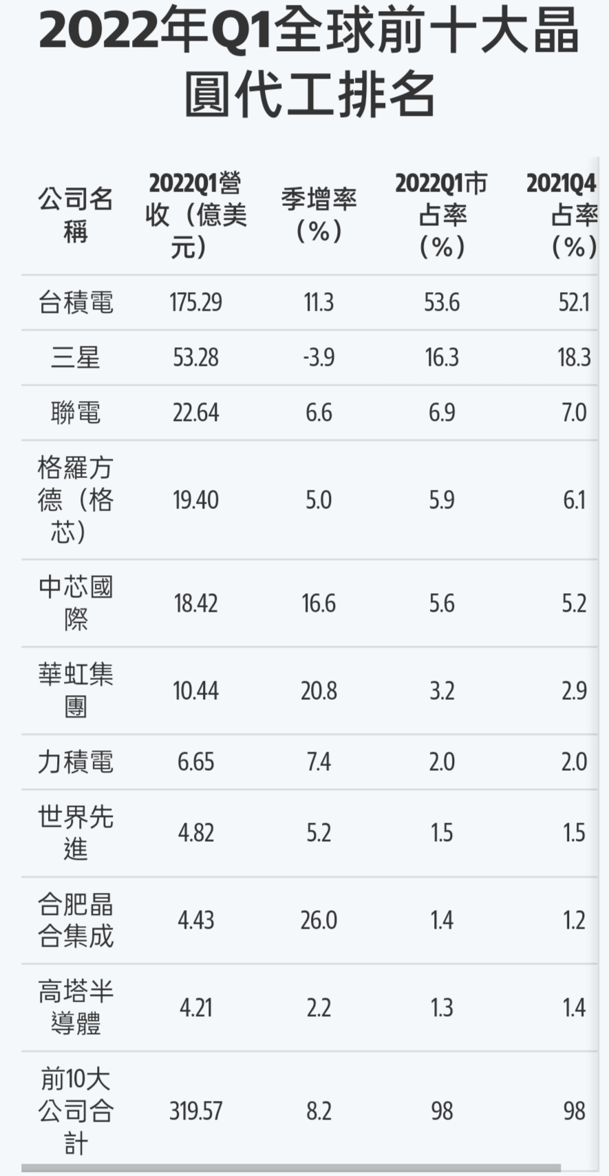 更不用說台灣的晶圓代工廠除了台積電(52.6%)以外還有聯電(6.9%)、力積電(2%)、世界先進(1.5%),